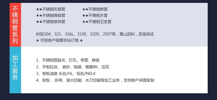 贊譽公司主要生產以201、202、304和316材質為主的不銹鋼品用,機械構造用,建筑裝飾用不銹鋼焊管,同時也可按照客戶要求定做:310、430 、409等各種材質。